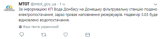3 марта на станцию было подано электроснабжение, сейчас идет наполнение резервуаров. Об этом сообщает компания "Вода Донбасса" на своей странице в Facebook.