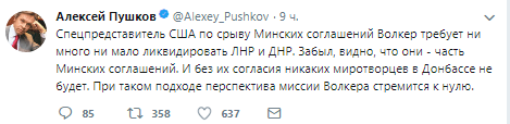 "Спецпредставитель США по срыву Минских соглашений Волкер требует ни много ни мало ликвидировать" ЛНР "и" ДНР ". Забыл, очевидно, что они - часть Минских соглашений. И без их согласия никаких миротворцев на Донбассе не будет. При таком подходе перспектива миссии Волкера снижается до нуля ", - написал Пушков.
