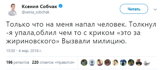 Сегодня, 4 марта, в центре Москвы напали на кандидата в президенты России Ксению Собчак после того, как в эфире одного из российских телеканалов она облила водой Жириновского. О нападении она сообщила на своей странице в Twitter.