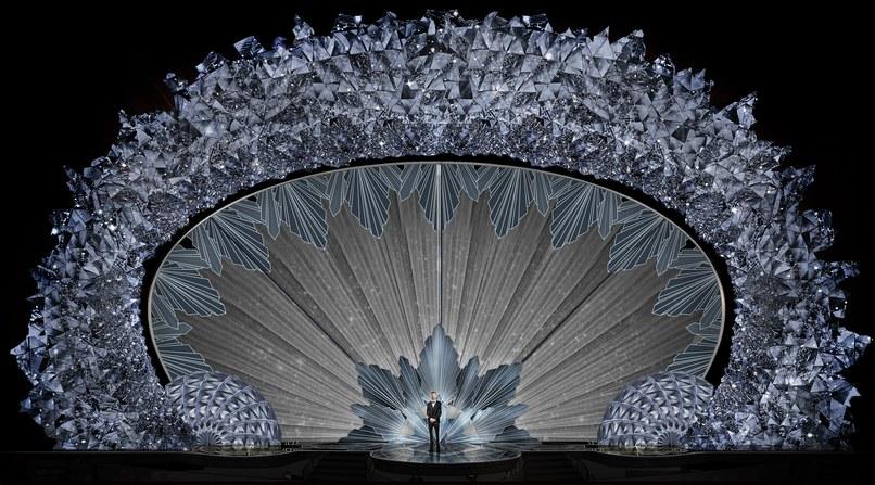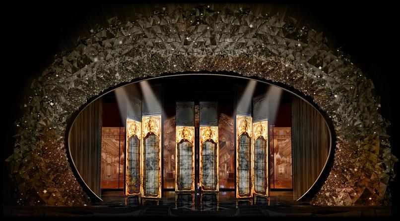 Вдохновленный светом и его отражениями, дизайнер решил создать арку с использованием 45 миллионов кристаллов Swarovski перед кулисой, чтобы создать потрясающий фон.