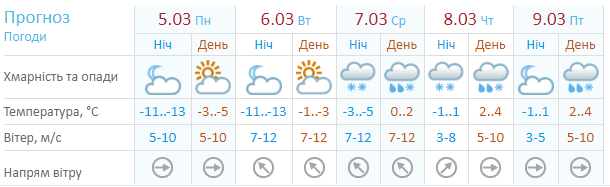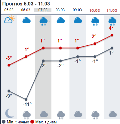 Ресурс Мeteoprog.ua обещает -1...-3 5 и 6 марта и потепление до +1...+4 с 7 марта. В среду и на выходных - сне с дождем.