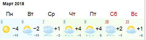 Сайт Gismeteо также прогнозирует прогнозирует небольшой минус в начале недели и потепление с 7 марта до +1...+4. Осадки ожидаются во все дни, кроме понедельника и воскресенья.