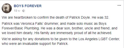 Барабанщик британской инди-поп группы Veronica Falls, автор песен Boys Forever Патрик Дойл умер в возрасте 32 лет.