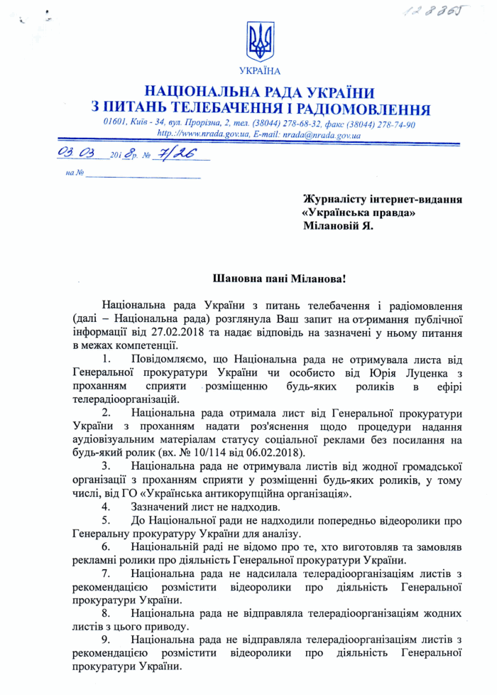 "Национальный совет получил письмо от Генпрокуратуры Украины с просьбой предоставить разъяснение о предоставлении аудиовизуальным материалам статуса социальной рекламы без ссылки на любой ролик (вх. № 10/114 от 06.02.2018), - говорится в ответе.