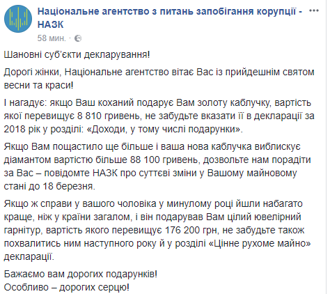 "Дорогие женщины, Национальное агентство поздравляет Вас с грядущим праздником весны и красоты и напоминает: если Ваш любимый подарит Вам золотой перстенек, стоимость которого превышает 8 810 грн, не забудьте указать его в декларации за 2018 год в разделе: "Доходы, в том числе подарки", - сообщается в соцсети.