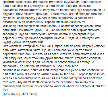 "Следствием вынесенного мной судебного решения стало... внесение в отношении меня сведений в ЕРДР прокуратурой Харьковской области за "заведомо неправосудное решение", меня и помощника с секретарем допрашивали следователи прокуратуры, вскоре ожидаю подозрение, прослушку телефонов и другие "прелести непослушания". Таким образом, и мне, и другим судьям, наглядно показаны последствия суддейской беспристрастности и непредвзятости", - заявил Невядомский.