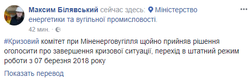 Кризисный комитет при Минэнергоугля заявил о завершении кризисной ситуации и переход в штатный режим работы с 7 марта. Об этом сообщил советник министра угольной промышленности и энергетики Максим Билявский в Facebook.