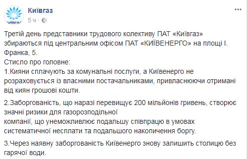 "Киевляне платят за коммунальные услуги, а "Киевэнерго" не рассчитывается со своими поставщиками, присваивая полученные от киевлян денежные средства. Задолженность сейчас превышает 200 млн грн, создает значительные риски для газораспределительной компании, что делает невозможным дальнейшее сотрудничество в условиях систематической неуплаты и дальнейшего накопления долга. Из-за имеющейся задолженности "Киевэнерго" вновь оставит столицу без горячей воды", - говорится в сообщении.