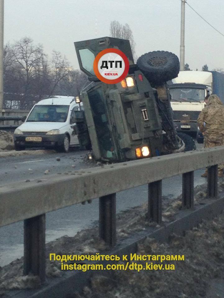 Днем вторника, 6 марта в Киеве произошло ДТП с военным бронеавтомобилем Cougar. В районе Нивок машина "легла на бок" на проезжей части. Об этом сообщает Информатор.
