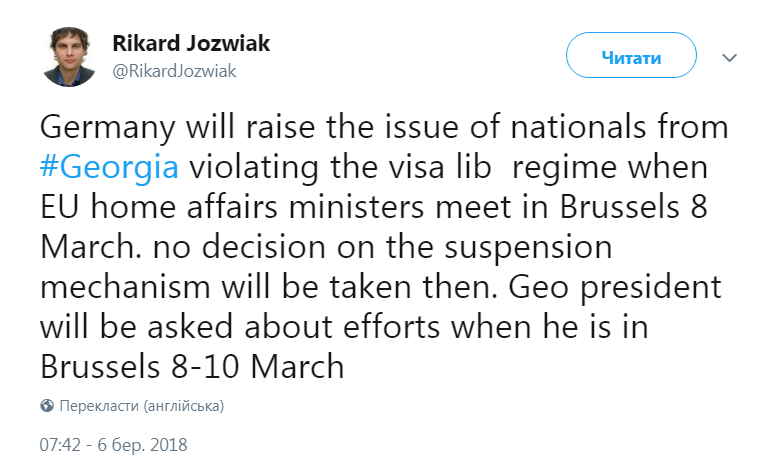 "Германия поднимет вопрос граждан Грузии, нарушающих условия визовой либерализации с ЕС, во время встречи министров внутренних дел в Брюсселе 8 марта", - написал журналист.