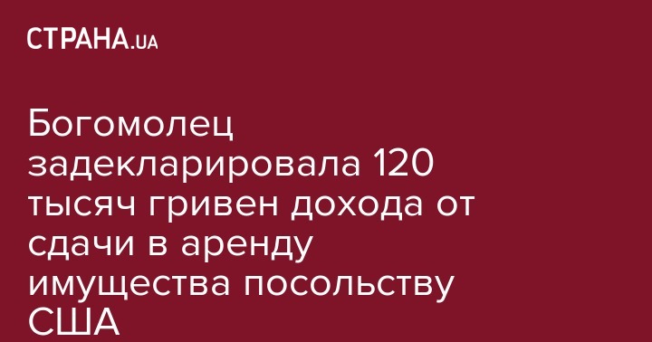 Глава парламентского комитета по вопросам здравоохранения и депутат от БПП Ольга Богомолец задекларировала 120 013 гривен дохода от предоставления имущества в аренду посольству США в Украине.