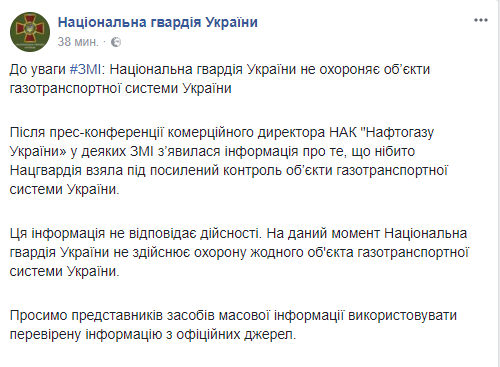 "После пресс-конференции коммерческого директора НАК "Нафтогаз Украины" в некоторых СМИ появилась информация о том, что якобы Нацгвардия взяла под усиленный контроль объекты газотранспортной системы Украины. Эта информация не соответствует действительности. На данный момент Национальная гвардия Украины не осуществляет охрану ни одного объекта газотранспортной системы Украины. Просим представителей средств массовой информации использовать проверенную информацию из официальных источников", - говорится в сообщении.