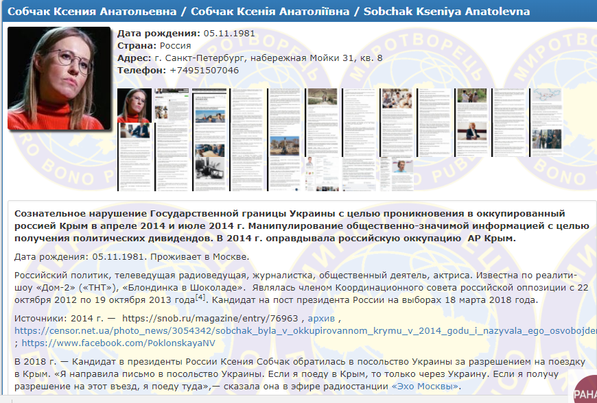 На сайте сказано, что в 2014 году Собчак оправдывала российскую оккупацию АР Крым.