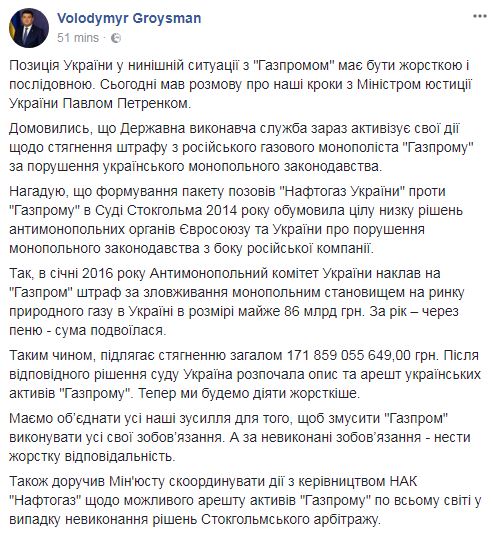 "Государственная исполнительная служба сейчас активизирует свои действия по взысканию штрафа с российского газового монополиста "Газпрома за нарушение украинского монопольного законодательства. После соответствующего решения суда Украина начала описание и арест украинских активов "Газпрома". Теперь мы будем действовать жестче. Должны объединить все наши усилия для того, чтобы заставить "Газпром" выполнять все свои обязательства. А за невыполненные обязательства - нести жесткую ответственность", – написал Гройсман.