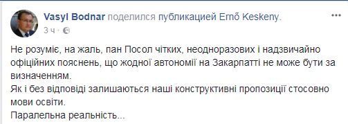 "Не понимает, к сожалению, господин посол четких, неоднократных и очень официальных объяснений, что никакой автономии в Закарпатье не может быть по определению. Как и без ответа остаются наши конструктивные предложения относительно языка образования. Параллельная реальность...", - написал Боднарь.