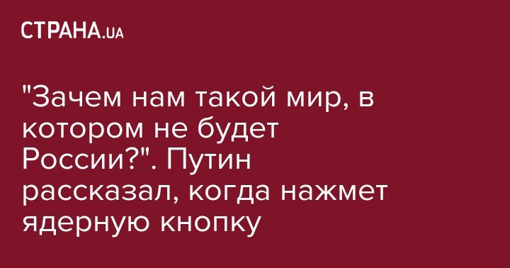 "То есть, если кем-то принято решение уничтожить Россию, тогда у нас возникает полное право ответить, - заявил он. - Да, для мира это будет глобальная катастрофа. Но, как гражданин России и как глава государства я хочу задаться вопросом: а зачем нам такой мир, если в нем не будет России?".