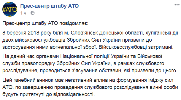 "8 марта 2018 возле г. Славянск Донецкой области хулиганские действия двух военнослужащих Вооруженных Сил Украины привели к применению ими огнестрельного оружия. Военнослужащие задержаны", - говорится в опубликованном сообщении.