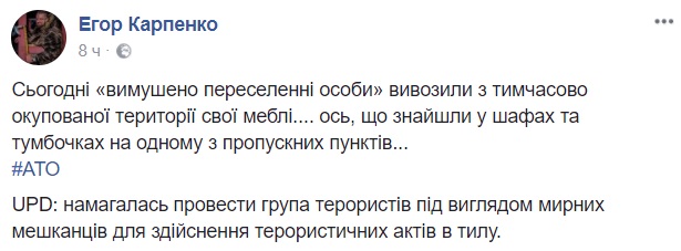 "Сегодня вынужденные переселенцы вывозили с временно оккупированной территории свою мебель... Вот что нашли в шкафах и тумбочках на одном из пропускных пунктов", – отмечает он.