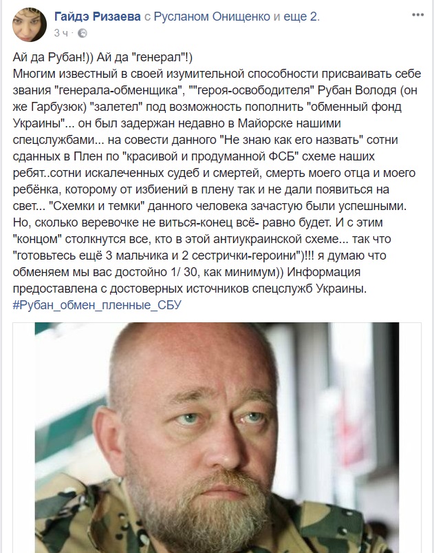 В комментариях "Стране" Гайдэ уточнила, что пока не может обнародовать все известные ей данные инцидента с главой "Офицерского корпуса". Вместе с этим она заявила, что Рубана задержали "при попытке пересечения границы с запрещенными предметами". Это произошло 8 марта в обеденное время. По сведениям Ризаевой, в процессе его задержания участвовали сотрудники Службы безопасности Украины и контрразведки.