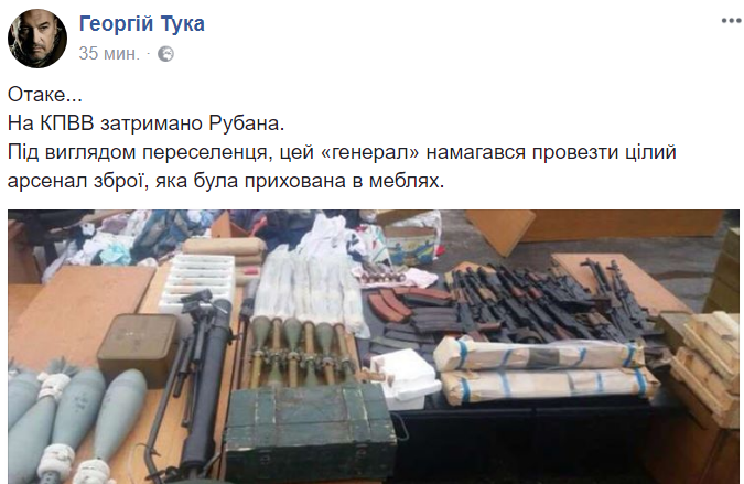"На КПВВ задержали Рубана. Под видом переселенца, этот "генерал" пытался провезти целый арсенал оружия, который был скрыт в мебели", - написал у себя в Facebook замминистра по делам оккупированных территорий Георгий Тука.