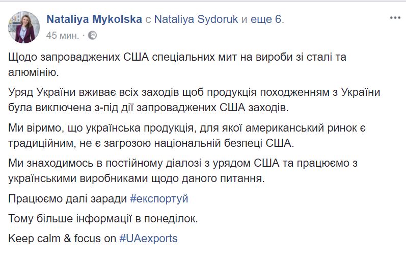 Кабинет министров принимает меры для выведения украинской продукции из-под санкций США на изделия из стали и алюминия. Об этом заместитель министра экономического развития и торговли - торговый представитель Украины Наталия Микольская написала на своей странице в Facebook.