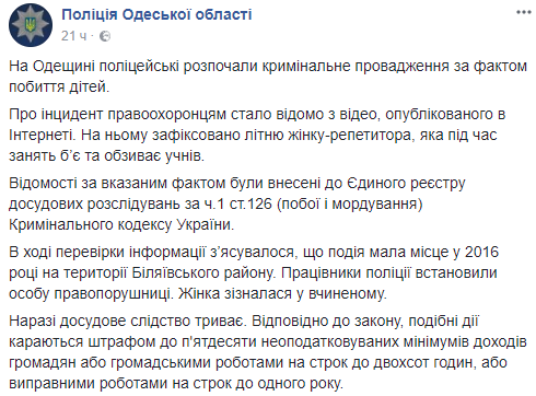 Полиция начала уголовное производство по факту избиения детей женщиной-репетитором в Одесской области. Об этом сообщает пресс-служба Главного управления Нацполиции Украины в Одесской области на своей странице в Facebook.