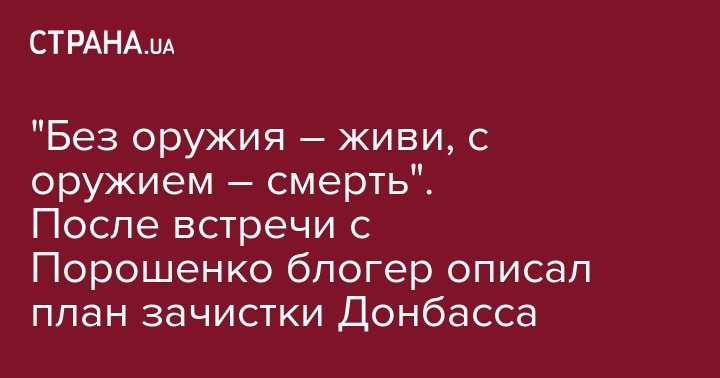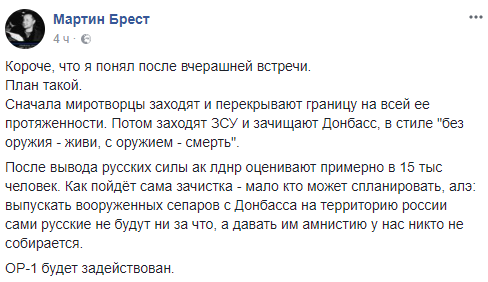 "Короче, что я понял после вчерашней встречи. План такой. Сначала миротворцы заходят и перекрывают границу на всей ее протяженности. Потом заходят ЗСУ и зачищают Донбасс, в стиле "без оружия – живи, с оружием – смерть". После вывода русских силы АК "ЛДНР" оценивают примерно в 15 тысяч человек. Как пойдет сама зачистка – мало кто может спланировать, алэ: выпускать вооруженных сепаров с Донбасса на территорию России сами русские не будут ни за что, а давать им амнистию у нас никто не собирается. ОР-1 будет задействован", – написал блогер.