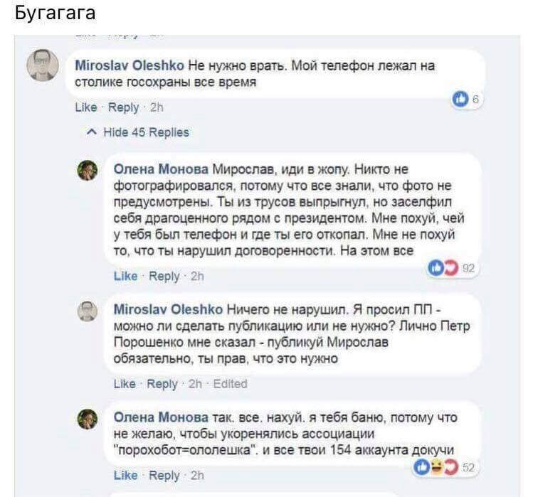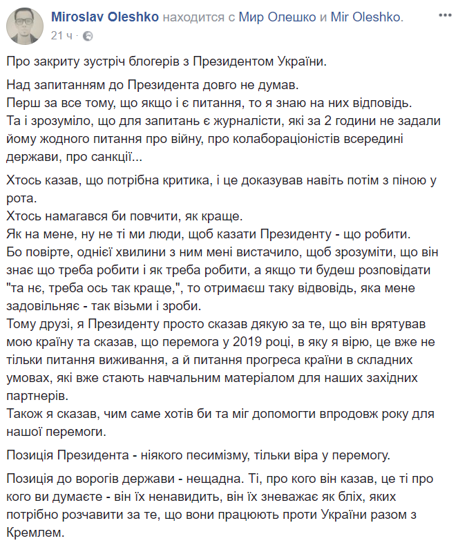 Об этом стало известно из поста одного из самых известных авторов пропрезидентского толка – Мирослава Олешко. Он выложил совместное селфи с Порошенко. Позже факт встречи подтвердили и остальные ее участники.
