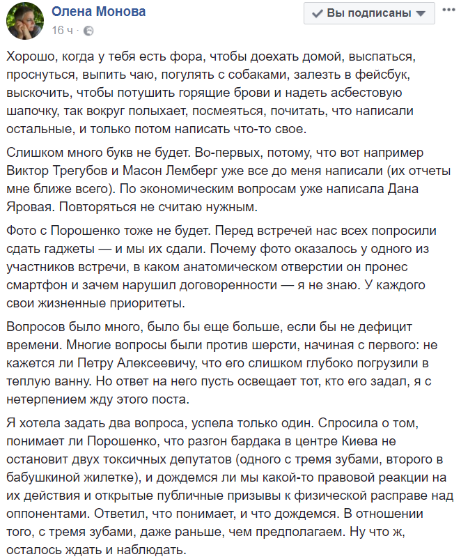 Блогер Елена Монова была довольно сдержанна, но в конце своего поста не удержалась от вычурных метафор. Она сравнила Порошенко с паровозом, который набрал ход, и его уже не остановить.