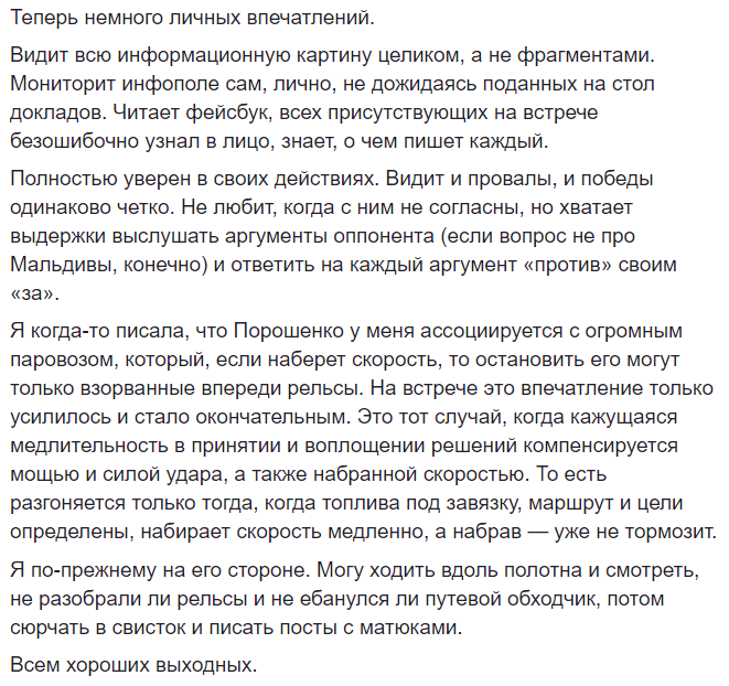 "Я когда-то писала, что Порошенко у меня ассоциируется с огромным паровозом, который если наберет скорость, то остановить его могут только взорванные впереди рельсы. На встрече это впечатление только усилилось и стало окончательным. Это тот случай, когда кажущаяся медлительность в принятии и воплощении решений компенсируется мощью и силой удара, а также набранной скоростью. То есть разгоняется только тогда, когда топлива под завязку, маршрут и цели определены, набирает скорость медленно, а набрав – уже не тормозит", – дает развернутую метафору Монова.