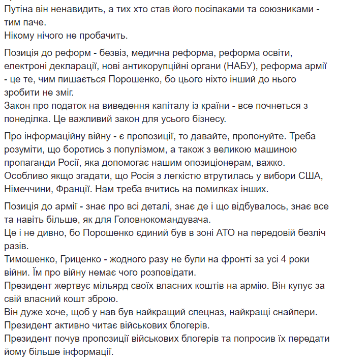 Далее Олешко расписывает достижения Порошенко (безвиз, медреформа и так далее), говорит о его нетерпимости к врагам (речь главным образом о внутренних, из которых в тексте упомянута Тимошенко) и переходит к финалу: