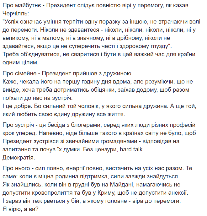 "Сил (у Порошенко. – Прим. Ред.) полно, энергии полно, хватит на всех нас вместе. То же самое: когда есть крепкая семейная поддержка, силы всегда найдутся. Как нашлись, когда он в декабре был на Майдане, пытаясь не допустить кровопролития и был в Крыму, чтобы не допустить аннексии. И сейчас он тоже рвется в бой, в котором главное – вера к победе".