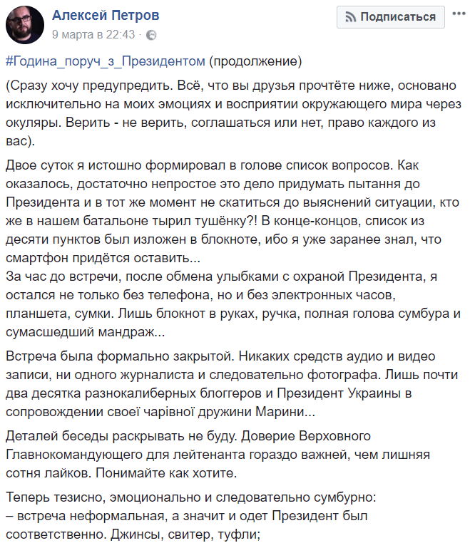 Позже он компенсировал свой "проступок" ярким панегириком. Вот как он описывает встречу с Порошенко: