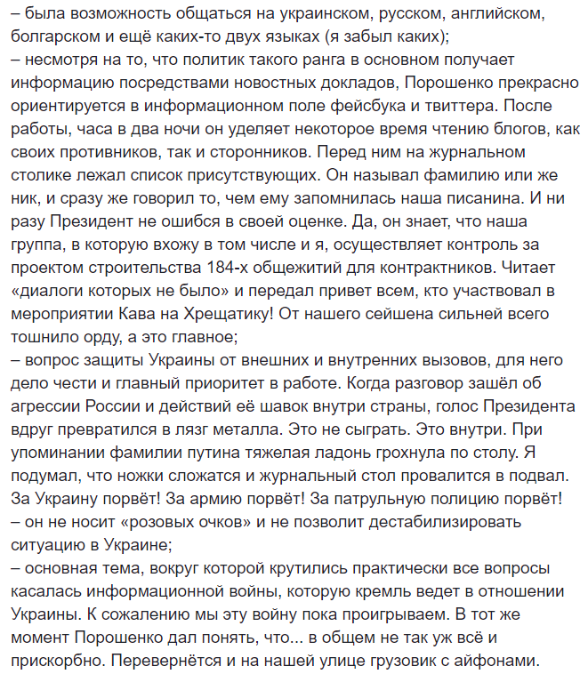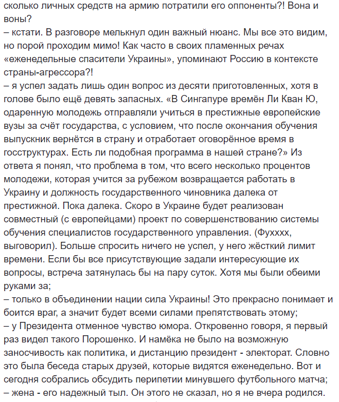 "У Президента отменное чувство юмора. Откровенно говоря, я первый раз видел такого Порошенко. И намека не было на возможную заносчивость как политика и дистанцию президент – электорат. Словно это была беседа старых друзей, которые видятся еженедельно. Вот и сегодня собрались обсудить перипетии минувшего футбольного матча".