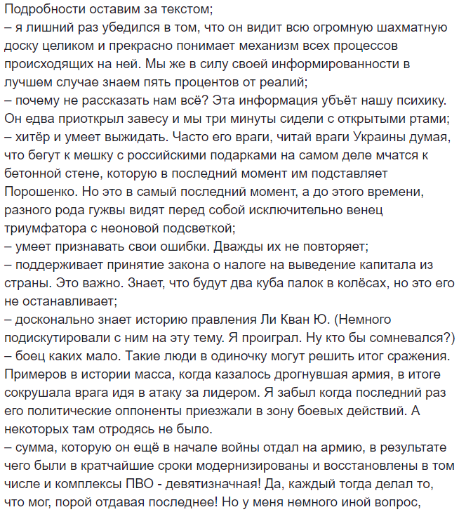 "Вопрос защиты Украины от внешних и внутренних вызовов для него дело чести и главный приоритет в работе. Когда разговор зашел об агрессии России и действий ее шавок внутри страны, голос Президента вдруг превратился в лязг металла. Это не сыграть. Это внутри. При упоминании фамилии путина тяжелая ладонь грохнула по столу. Я подумал, что ножки сложатся и журнальный стол провалится в подвал.
