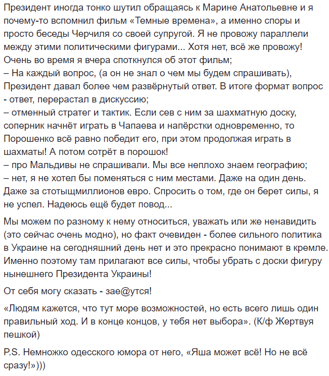 "Я давно пытался понять, а почему собственно Порошенко не хочет нанять на работу тех, кто все это время тащит на себе защиту информпространства? Вот теперь, кажется, понял: потому что он такой же. Он безмерно уважает то, что мы делаем, то что мы жертвуем на борьбу время, деньги и силы, но он делает то же самое.
