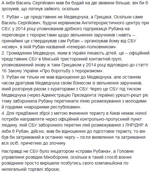 4. Для приобретения оружия с целью совершения теракта в Киеве нет никакой необходимости направлять через официальный контрольно-пропускной пункт человека, которому СБУ запретило пересечение линии разграничения с ЛНР/ДНР. А если бы Рубан действительно имел отношение к подготовке теракта, то он был бы задержан в последнюю очередь – после выявления и задержания всех лиц, причастных к преступлению."