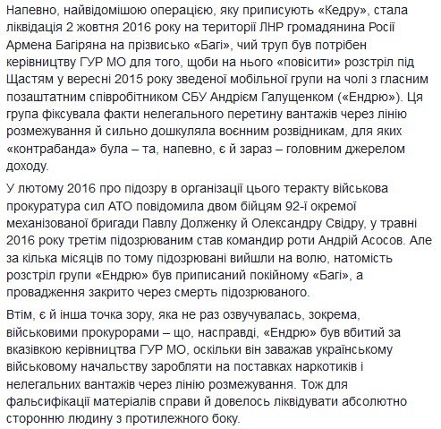 Наверное, самой известной операцией, которую приписывают Кедру, стала ликвидация 2 октября 2016 года на территории "ЛНР" гражданина России Армена Багиряна по прозвищу Багги, чей труп был нужен руководству ГУР МО для того, чтобы на него "повесить" расстрел под Счастьем в сентябре 2015 года сводной мобильной группы во главе с внештатным сотрудником СБУ Андреем Галущенко (Эндрю). Эта группа фиксировала факты нелегального пересечения грузов через линию разграничения и сильно донимала военных разведчиков, для которых "контрабанда" была – и, наверное, есть и сейчас – главным источником дохода.