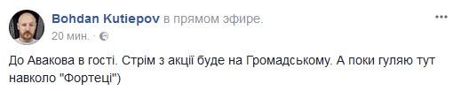 "К Авакову в гости. Стрим с акции будет на Громадском. А пока гуляю здесь вокруг "Крепости"", - написал он.