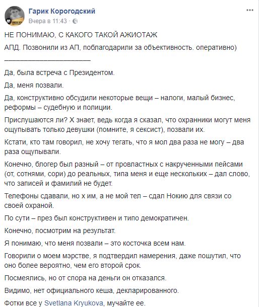 Сначала в шутку заместитель главного редактора "Страны" Светлана Крючкова написала, что на встрече был и Гарик Корогодский в качестве блогера.