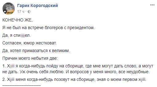 Корогодский также объяснил, почему не пошел бы на подобное мероприятие: "Конечно же, я не был на встрече блогеров с президентом. Согласен, юмор жестковат. Да, хотел примазаться к великим. Причин моего небытия две: