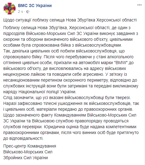 Инцидент был спровоцирован тем, что несколько гражданских лиц избили военнослужащего, сообщает в Facebook пресс-служба ВМС ВС Украины.