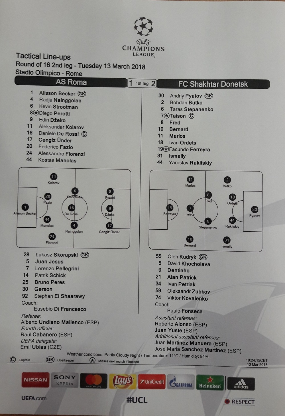 19.47 Перед сегодняшним матчем можно предаться приятной ностальгии и вспомнить, как "черно-оранжевые" выбили Рому из 1/8 Лиги чемпионов сезона 2010/11. Тогда Шахтер не оставил от Ромы буквально камня на камне, победив по итогам двух матчей с общим счетом 6 - 2. Первый матч в Риме закончился очень трудной и волевой победой Шахтера - 3 - 2. А в Донецке "горняки" отгрузили "волкам" три безответных мяча.