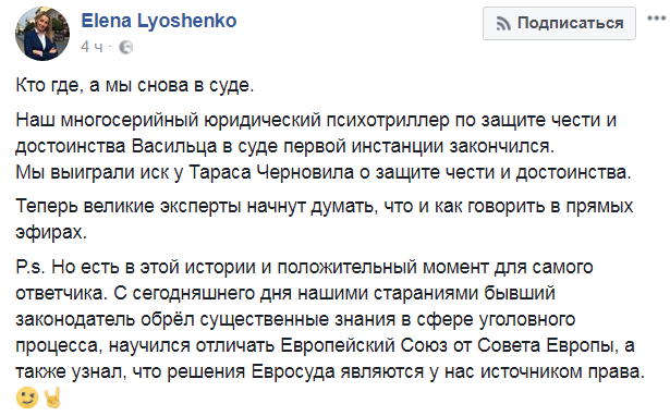 На своей Facebook-странице она назвала это дело против Чорновила "многосерийным юридическим психотриллером по защите чести и достоинства".