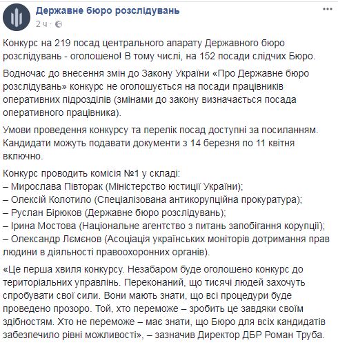 "Конкурс на 219 должностей центрального аппарата Государственного бюро расследований - объявлен! В том числе, на 152 должности следователей Бюро", - говорится в сообщении.