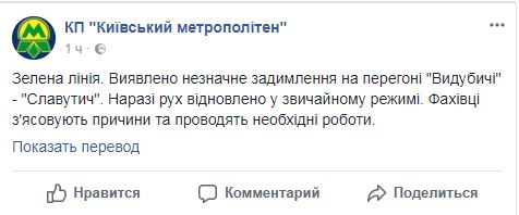 "Зеленая линия. Выявлено незначительное задымление на перегоне "Выдубичи" - "Славутич". Сейчас движение возобновлено в обычном режиме. Специалисты выясняют причины и проводят необходимые работы", - говорится в сообщении.