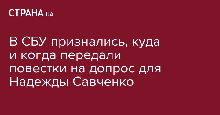 Повестки на допрос внефракционного народного депутата Украины Надежды Савченко, которые должны состояться во вторник, 13 марта, и в четверг, 15 марта, была передана в аппарат Верховной Рады в понедельник, 12 марта, сообщает Служба безопасности Украины. Ранее у Савченко заявили, что повестку не получали.