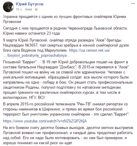 "9 марта Юрий Луговский, снайпер отряда разведки "Азов" бригады Нацгвардии №3057, пал смертью храбрых в ночной снайперской дуэли близ села Водяное под Мариуполем" - написал он.