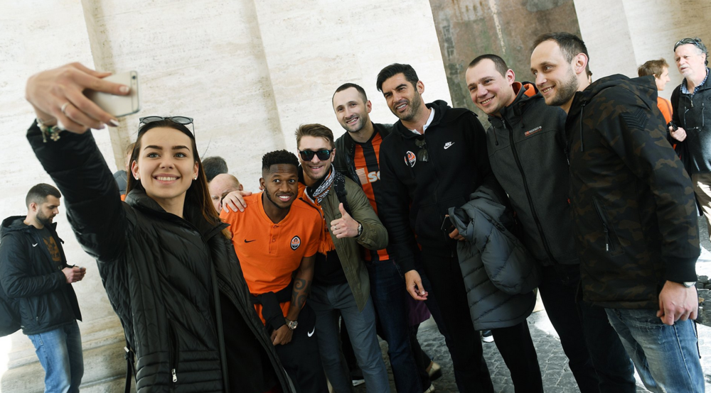 Сегодня, 13 марта, донецкий Шахтер сыграет с Ромой ответный матч 1/8 Лиги чемпионов. После обеда команда вышла на традиционную прогулку по городу, и болельщики не упустили своего шанса сделать совместные фото с любимыми игроками.
