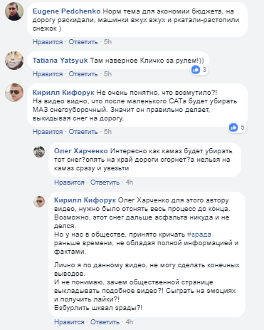 "Не очень понятно, что возмутило?! На видео видно, что после маленького САТа будет убирать МАЗ снегоуборочный. Значит он правильно делает, выкидывая снег на дорогу", - пояснил Кирилл Кифорук и добавил, что в обществе привыкли кричать "зрада" раньше времени.